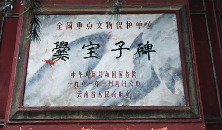 在越州楊旗出土的爨寶子碑全稱為“晉故振威將軍建寧太守爨府君墓”碑,立于東晉大亨四年(公元405年)!鹅鄬氉颖肥请`書向楷書過渡的典型碑刻;碑文通篇為六朝時期的駢文體;也是研究南北朝時期云南地方史不可多得史料。1961年,國務(wù)院將其公布為第一批全國重點文物保護單位。存于曲靖一中。
