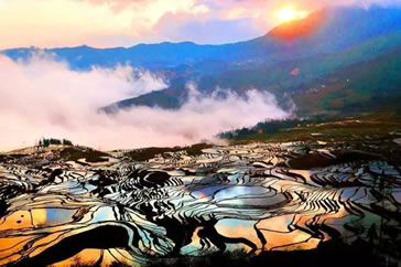 紅河哈尼梯田位于云南南部,遍布于紅河州元陽、紅河、金平、綠春四縣,總面積約100萬畝,僅元陽縣境內(nèi)就有17萬畝梯田。元陽梯田是哈尼族人1300多年來生生不息地“雕刻”的山水田園風(fēng)光畫。2013年(癸巳年)6月22日在第37屆世界遺產(chǎn)大會(huì)上紅河哈尼梯田被成功列入世界遺產(chǎn)名錄,成為中國(guó)第45處世界遺產(chǎn)。