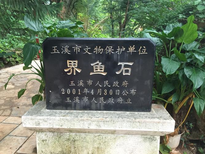 界魚石界魚石屬碳酸鹽巖石礫塊,石塊壁面上有經(jīng)地質(zhì)時(shí)期溶蝕形成的溶孔。界魚石背靠野牛山,面臨連通星云湖撫仙湖的玉帶河。石塊所在的北岸山坡林木茂密。玉帶河寬70m,水深3-4m,長(zhǎng)約2.1km,在界魚石上題刻有“界魚石”,及清江川縣令李密題書“石怪鱗驚”,鐵嶺竺文人兆鵬題書“魚各有性”。