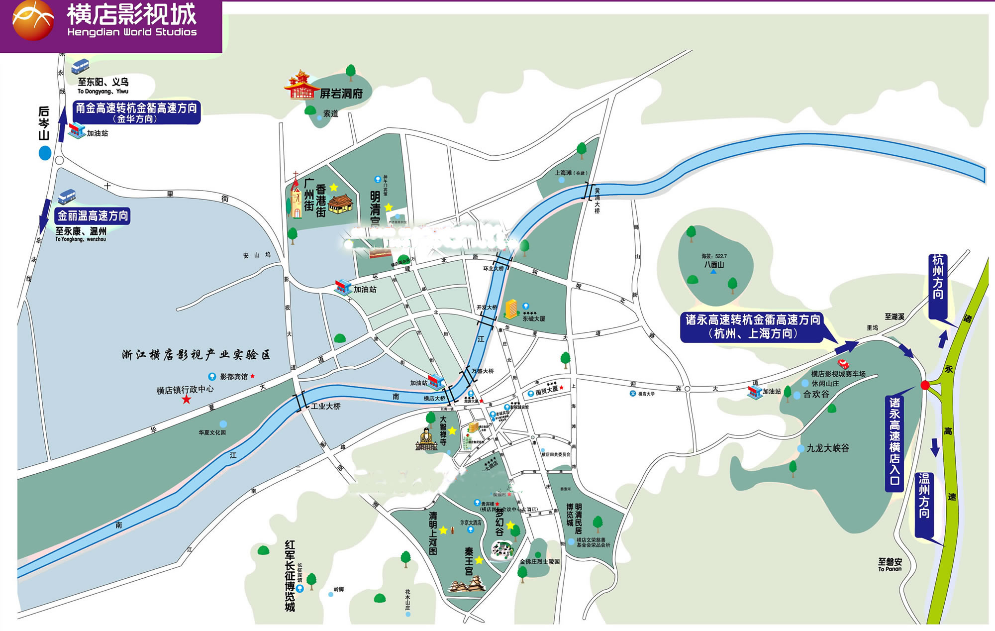 江西方向:梨溫高速—杭金衢高速—甬金高速,東陽出口下,抵橫店