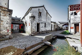 老街兩旁都是長板門面的店鋪。緊鄰老街是一幢幢至今保存完整的古建筑群,梁枋門窗上滿是雕飾,精巧的躍魚馬頭墻和脊塑墻花具有獨(dú)特的地方風(fēng)格。馬頭墻是古代江南富戶官宅威勢的象征,據(jù)說級數(shù)越多,職位越高。墻面嵌著雕花石窗,外墻上塑浮雕文字,墻尖塑著沖天而起的躍魚和飛龍,寓含“鯉魚跳龍門”之意。門柱上那兩只活動(dòng)的倒掛獅子,門墻上一對瓷盆中各飾有5只飛舞的蝙蝠,象征著五福臨門。大祠堂建于明洪武十八年。大廳有32根大圓柱,好比32顆象棋子,隱含全局一盤棋之意;每根柱子中間大,兩頭小,是典型的隋唐風(fēng)格明式建筑。