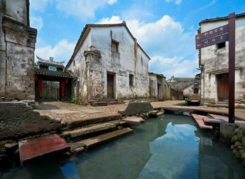 村落按“回”字九宮八卦式布局。童姓祖先按照八卦原理,把白溪水引進(jìn)村莊,潺潺溪水挨戶環(huán)流,人人可在溪水中洗菜凈衣,家家連流水小橋,戶戶通卵石坦途。青藤白墻黑瓦,石頭鏤花窗戶,雕梁畫棟門樓,蒼涼中顯現(xiàn)出昔日曾經(jīng)的繁華。
