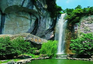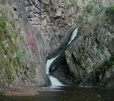 雙龍出海第二洩:二洩緊接一洩,落差為7.1米。瀑布下落時,被一塊兀石分成兩半,分流如珠簾飄動,開朗而又深沉,又如雙龍出游不知天高地厚,古人有詩贊其曰:兩龍爭壑不知應(yīng),一石橫空不渡人。