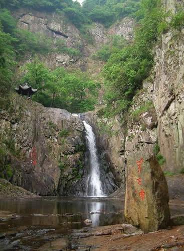 月籠輕紗第一洩:水流從石河瀉下,瀑布小巧平緩,柔美如月籠輕紗,雋永奇秀,“樂聲幽咽,萬松颯然,隔岸秋花爛漫,禽聲甚樂”,瀑布中間有一水潭,直徑1.5米,口微向內(nèi)收,四壁光滑,深不見底,人稱“小龍井”,俗呼小腳桶潭,是人工開鑿還是天然形成,還是一個謎,古人贊其曰:龍井鑿石灘,園勻如截竹;登波落纖埃,照見須眉綠。