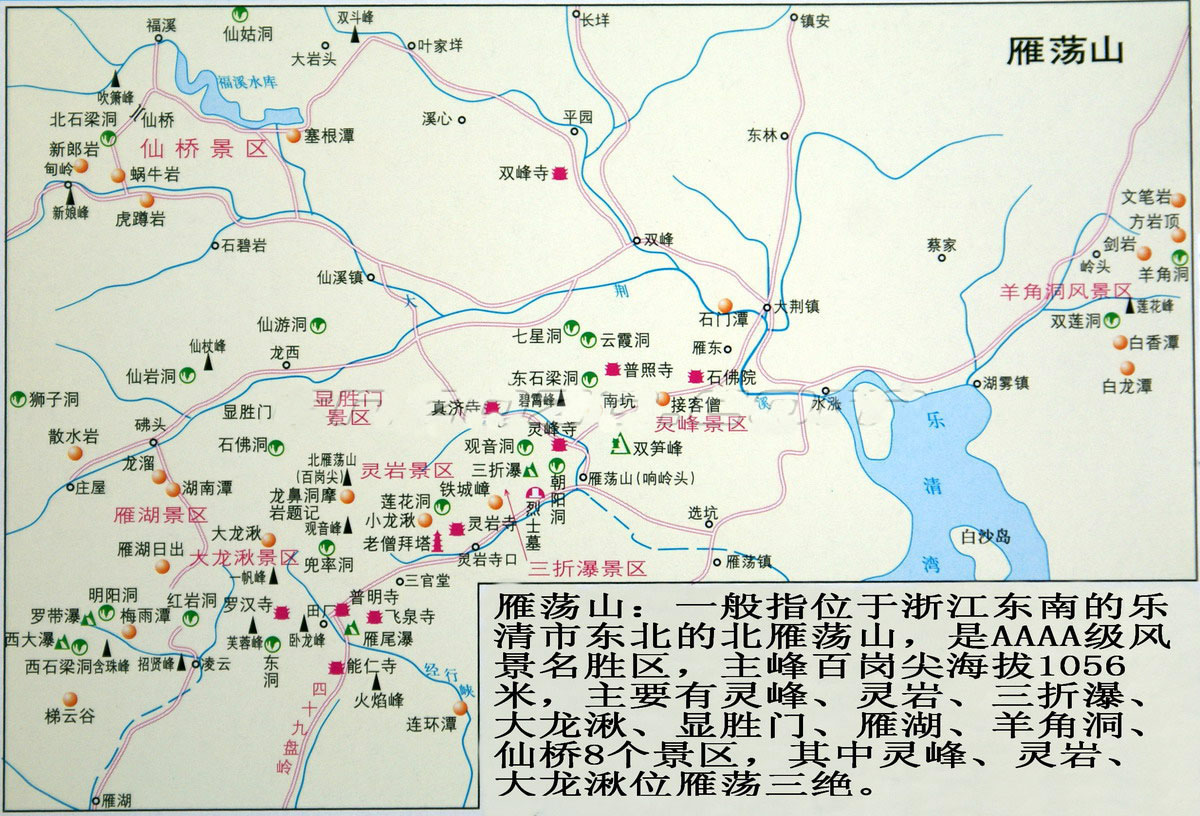 北雁蕩山位于樂(lè)清市境內(nèi)東北部,萬(wàn)山重疊,群峰爭(zhēng)雄,懸嶂蔽日,飛瀑凌空,古木參天,自古就有“寰中絕勝”之譽(yù),是全國(guó)十大名山之一。北雁蕩山有102峰、64巖、26石、46洞、14嶂、18瀑、28潭、13坑、13嶺、10泉、2水、8門、4闕、7溪1澗、8橋2湖、5尖2峽等,由此將其分為靈峰、靈巖、大龍湫、顯圣門、雁湖5個(gè)景區(qū)。