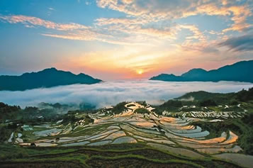 云和梯田如同一位四季美人:春穿花衫,水滿層疇:夏披綠紗,禾海滾浪;秋著紅裳,金穗漫山;冬裹銀裘,雪毯素裝。年復(fù)一年,山花不敗,鳴禽百囀,流泉不竭。日復(fù)一日,從山嵐染成金玫瑰,到白云變幻成蒼狗,一幕幕展現(xiàn)大自然造型和著色的奇詭。