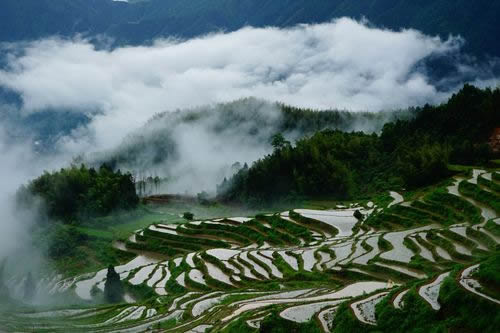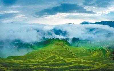 是梯田,是濕地,是澤國,形成亦山亦水的奇觀,來源于森林腹地恒久的涵養(yǎng)補(bǔ)給,只見云水天來,不見旱澇來襲。雨云象俏皮的村姑,出沒無定、行蹤無定,著裝無定,心情無定……忽而為項(xiàng)頸之哈達(dá),忽而為足下之地毯,忽而為纏腰之彩帶,親親云朵,感悟創(chuàng)意。這就是云和梯田——沉浮著的云水世界。