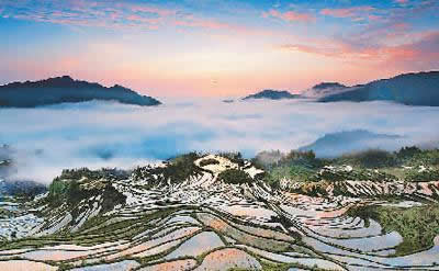 春來水滿田疇,如串串銀鏈掛山間;夏至佳禾吐翠,似層層綠浪排蒼穹;金秋,稻穗沉甸,像座座金塔頂玉宇;隆冬,雪兆豐年,若環(huán)環(huán)白玉砌云端。