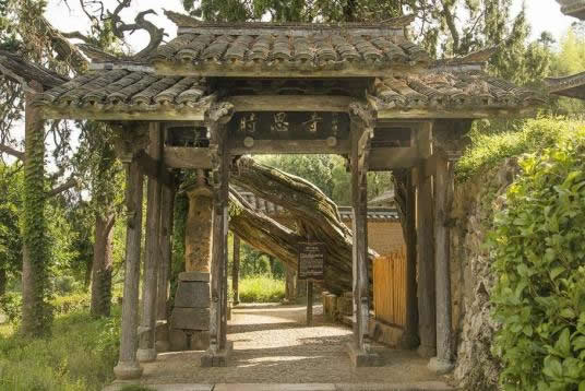 進(jìn)了山門,邁上幾級(jí)臺(tái)階,有一個(gè)黃土砂礫鋪筑的小天地,右側(cè)有石臺(tái)階,通向枝桿蒼虬的柳杉王;左側(cè)是下坡道,通向時(shí)思寺的鐘樓與大殿;迎面是一堵砂石黃泥壘筑的儀門,通向梅氏宗祠。
