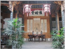 鐘池四周伸展出八條小巷,特點(diǎn)各個不同,形成了坎、艮、震、巽、離、坤、兌、乾八個部位。大公堂就在它的坎宮部位,從它的正門邊上東而去的一條十分幽深,一層層的臺階上坡,左側(cè)是綠蔭如蓋的園子,的一右側(cè)是一排排住宅的后墻,這條巷是通往村中十八廳堂之一的積慶堂的。鐘池東面條巷子很平直,100米長。八條小巷似通卻閉,似連卻斷,虛虛實(shí)實(shí),猶如一張蜘蛛網(wǎng),又宛如一座迷宮。